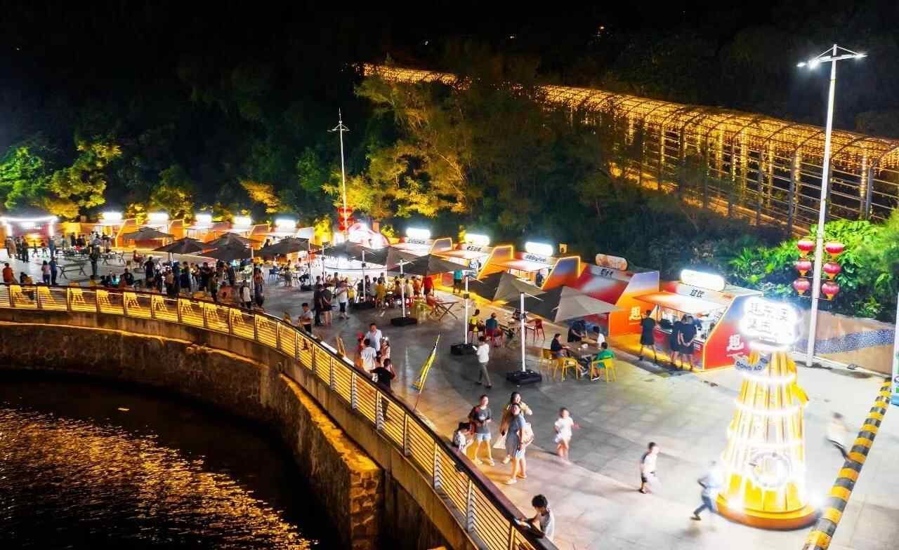 烤生蚝、卤鸭翅、章鱼小丸子……在3000多平方米的夏湾夜市,依次排开的摊位上汇聚着各类美食,吸引众多市民游客驻足品尝。杯盏碰撞声、叮叮咣咣的炒勺声、叫卖的吆喝声此起彼伏,跳动的炉火与五颜六色的招牌交相辉映,组成一幅声色十足的夜宴图。虽是“平民夜市”,“标配”却相当高,商家们的菜品各有特色,就餐环境干净、整洁。