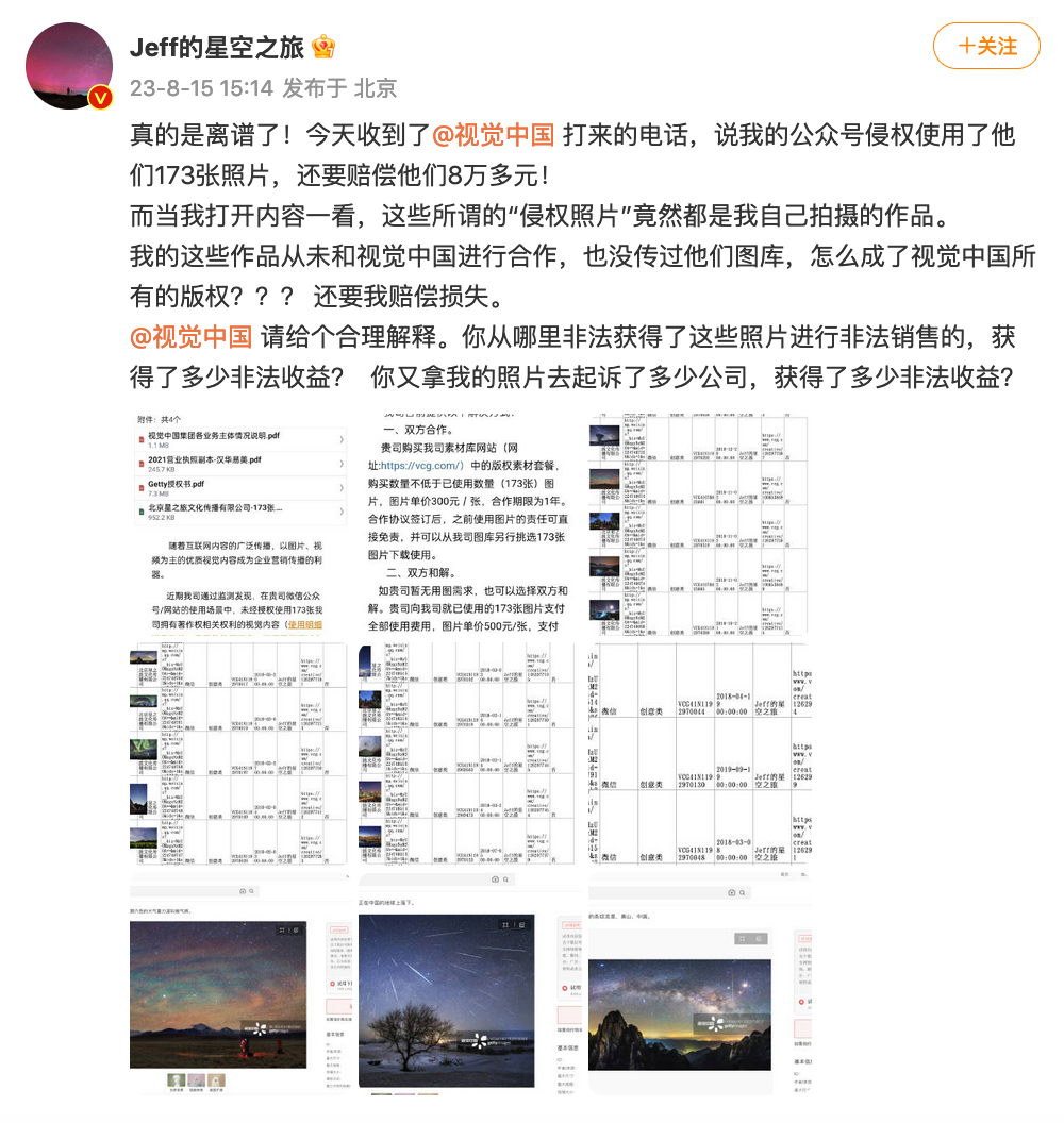 “真的是离谱了!今天收到了@视觉中国 打来的电话,说我的公众号侵权使用了他们173张照片,还要赔偿他们8万多元!”摄影师戴建峰@Jeff的星空之旅 8月15日下午发文称。