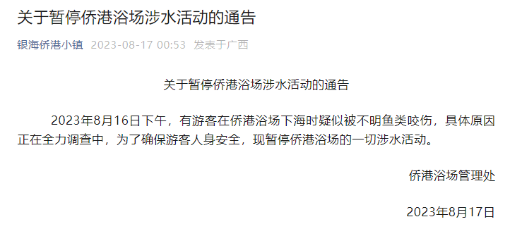 8月17日凌晨,北海市银海区侨港镇人民政府微信公众号“银海侨港小镇”发布《关于暂停侨港浴场涉水活动的通告》,通告称8月16日下午,有游客在侨港浴场下海时疑似被不明鱼类咬伤,具体原因正在全力调查中,为了确保游客人身安全,现暂停侨港浴场的一切涉水活动。