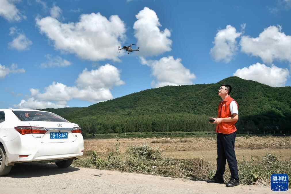 农业保险理赔人员使用无人机查看舒兰市金马镇周边农田受灾情况(8月15日摄)。
