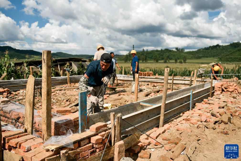 工作人员对舒兰市开原镇模范村的受损房屋进行重建工作(8月16日摄)。