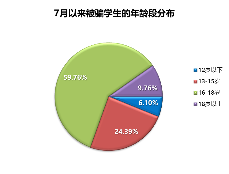 年龄段分布方面,以16-18岁阶段被骗的较多,占各年龄段的59.76%。