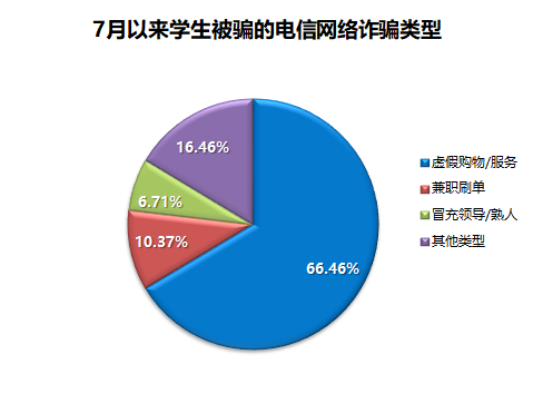 据市反诈骗中心统计数据显示,七月以来,有关学生被骗的警情明现增加,其中发案最多的是虚假购物/服务(买卖游戏账号、皮肤等为主)类诈骗,占全部类型的66.46%,合计损失超过160万元。