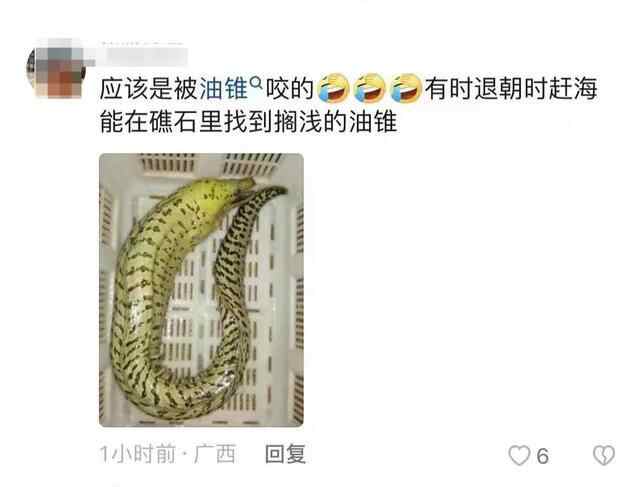 广西中医药大学海洋药物研究院刘昕明博士告诉红星新闻,油锥其实是裸胸鳝属的一种鱼类,一般生活在礁石区或者珊瑚礁区,如果是沙滩的话,不会有这个东西。“从那个伤口大小来看,我觉得也不像是这个裸胸鳝咬,裸胸鳝嘴没有那么大。从照片来看,这条鱼嘴张开至少有一个人大腿那么粗。裸胸鳝有一种比较大个体的,但是基本很少在我们这儿分布。”