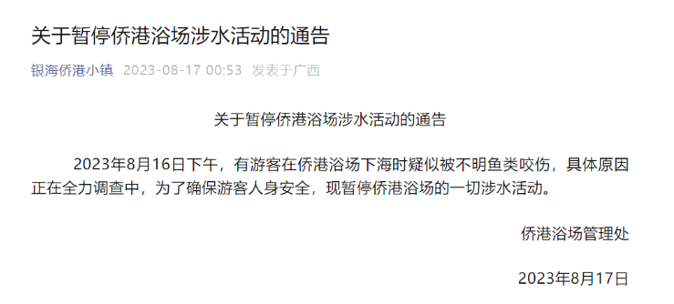 8月17日凌晨,银海侨港小镇微信公众号发布“关于暂停侨港浴场涉水活动的通告”:2023年8月16日下午,有游客在侨港浴场下海时疑似被不明鱼类咬伤,具体原因正在全力调查中,为了确保游客人身安全,现暂停侨港浴场的一切涉水活动。