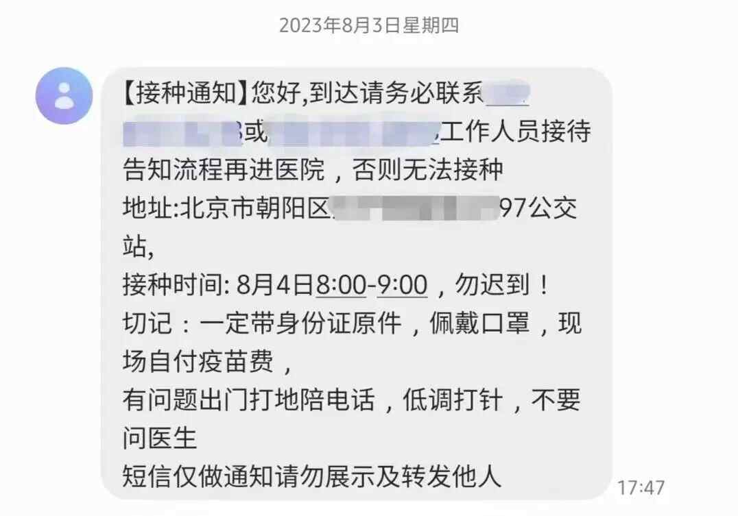 但意想不到的是,彩虹医生迟迟未告知其接种机构的地址和联系方式。直到8月3日,她才收到了一条短信——“您好,到达请务必联系XXX工作人员接待,告知流程再进医院,否则无法接种。切记,有问题出门打地陪电话,低调打针,不要问医生。”短信附上的地址不是医院门诊,而是一个公交站,这不禁令林小姐生疑。