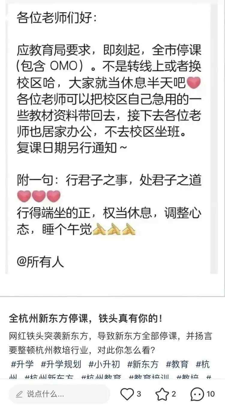 据媒体报道,新东方(NYSE:EDU)杭州线下中心近日突然全面关闭,起因是抖音网红铁头举报杭州新东方违规补课。