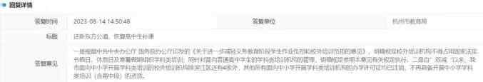 杭州市教育局8月14日答复称:一是根据中共中央办公厅 国务院办公厅印发的《关于进一步减轻义务教育阶段学生作业负担和校外培训负担的意见》,明确规定校外培训机构不得占用国家法定节假日、休息日及寒暑假期组织学科类培训;同时对面向普通高中学生的学科类培训机构的管理,明确规定参照本意见有关规定执行。二是自“双减”以来,我市面向中小学开展学科类培训的校外培训机构除滨江区还有4家外,其他所有面向中小学开展学科类培训机构的办学许可证均已注销,不再具备开展中小学学科类培训(含高中段)的资质。