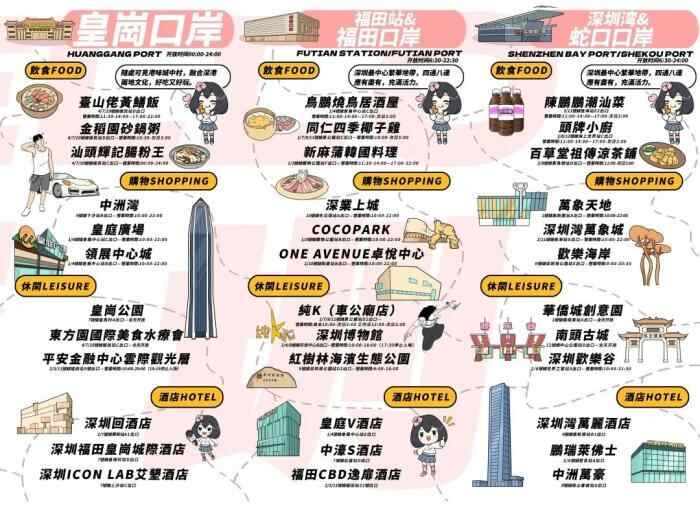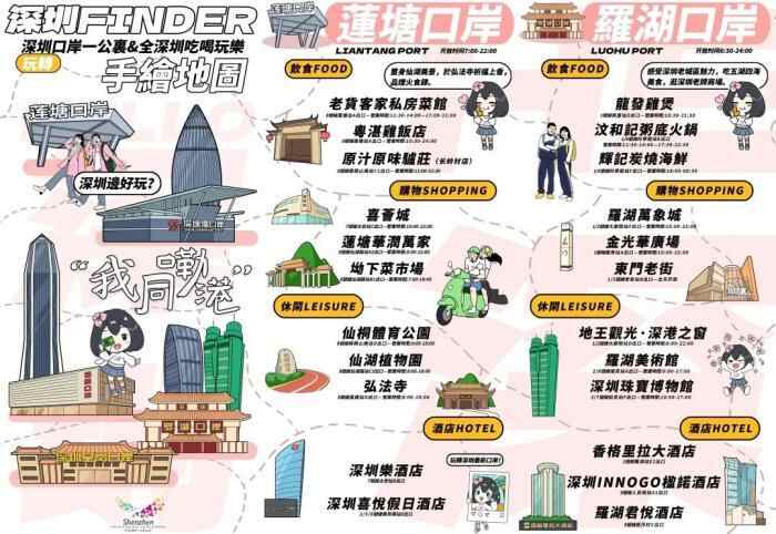 基于对港人来深出游喜好的调研,通过手绘地图的形式,i游深圳融媒体平台还推出了“我同嘞港”主题深圳旅游攻略折页。目前,深圳福田口岸、皇岗口岸、罗湖口岸、深圳湾口岸、莲塘口岸五大口岸均已在入境通道摆放折页,其他口岸也在上新中。