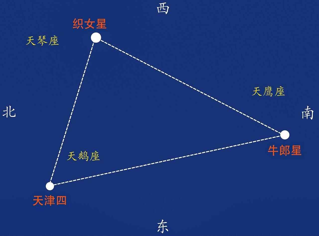 上述三颗星星从地球角度看,会在每年夏季组成一个直角三角形的组合。结合牛郎织女每年一度相会的典故,形成了“天津四化作鹊桥引导牛郎织女相会,天鹰天琴天鹅群星作伴”之景。
