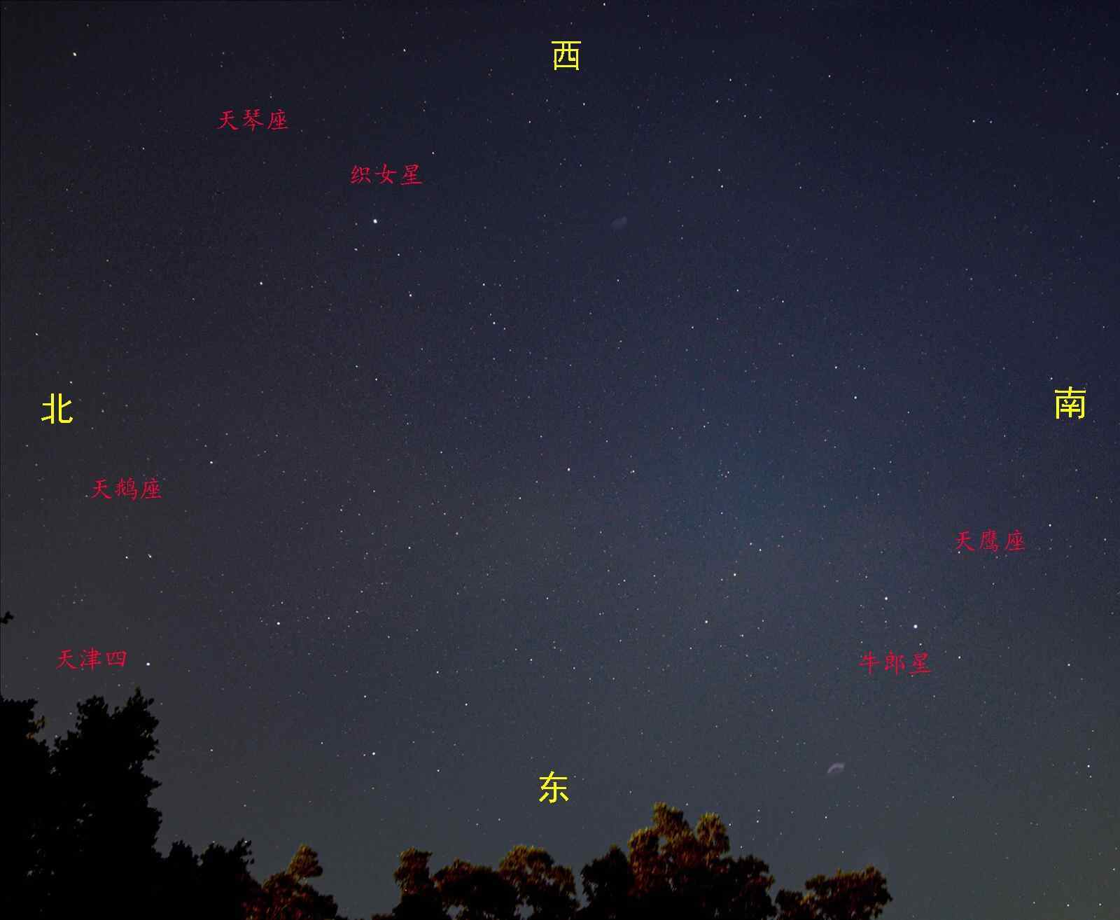 五羊天象馆相关专家介绍,民间俗称的“牛郎织女相会”现象,实乃每年夏季牛郎星、织女星、天津四星在夜空中组成的“夏季大三角”天象组合。当中的牛郎星是天鹰座最亮的恒星,视亮度为0.76星等;织女星是天琴座最亮的恒星,视亮度为0.03星等;天津四是天鹅座最亮的恒星,视亮度为1.25星等。