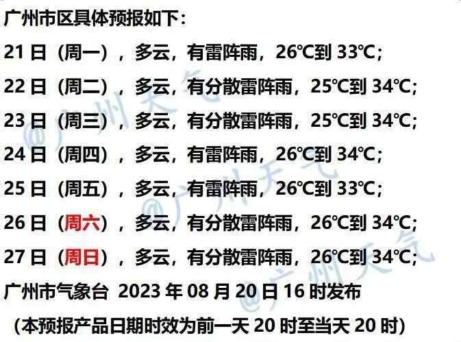 23日,多云,有分散雷阵雨,26℃~34℃。