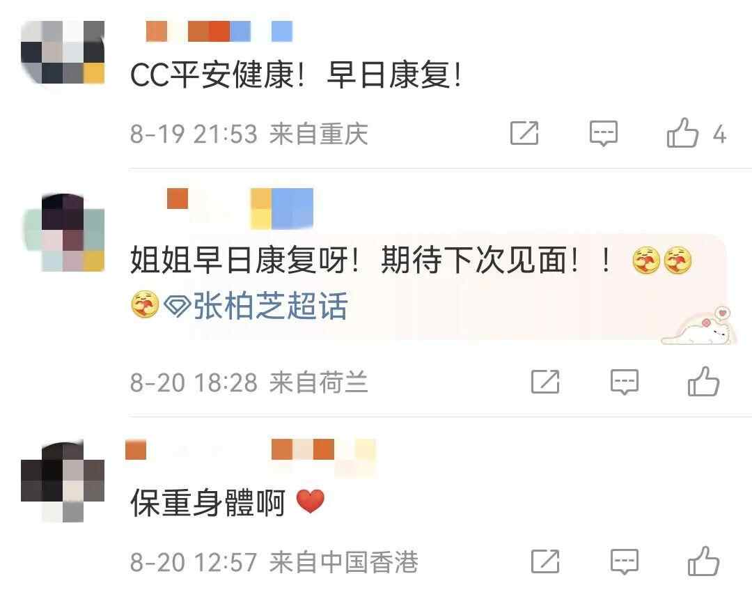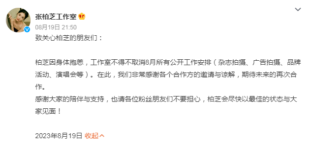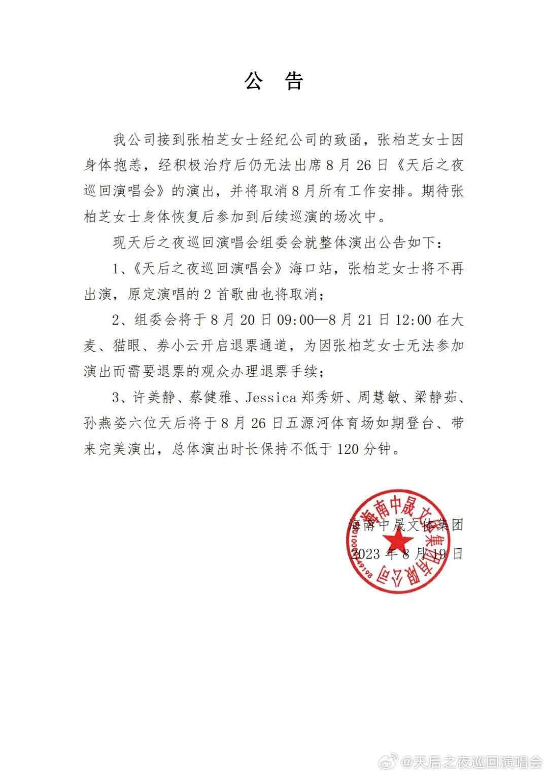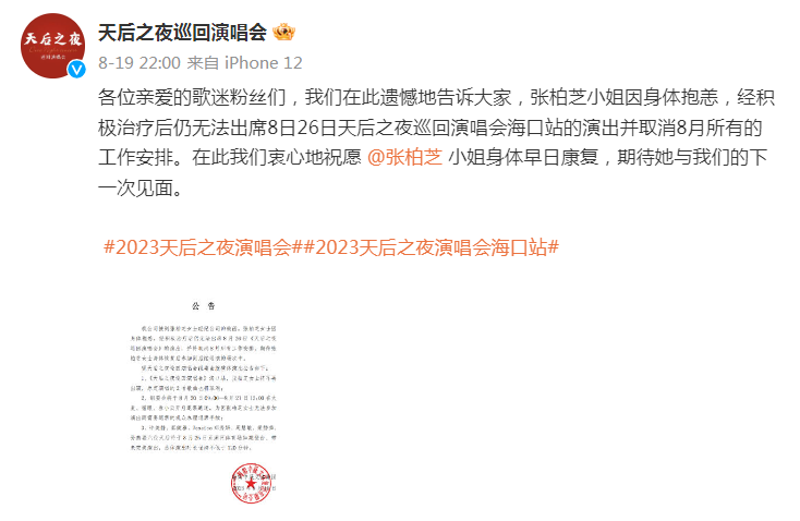 随后,“天后之夜巡回演唱会”官方账号发布公告称:“各位亲爱的歌迷粉丝们,我们在此遗憾地告诉大家,张柏芝小姐因身体抱恙,经积极治疗后仍无法出席8月26日天后之夜巡回演唱会海口站的演出并取消8月所有的工作安排。在此我们衷心地祝愿张柏芝小姐身体早日康复,期待她与我们的下一次见面。”