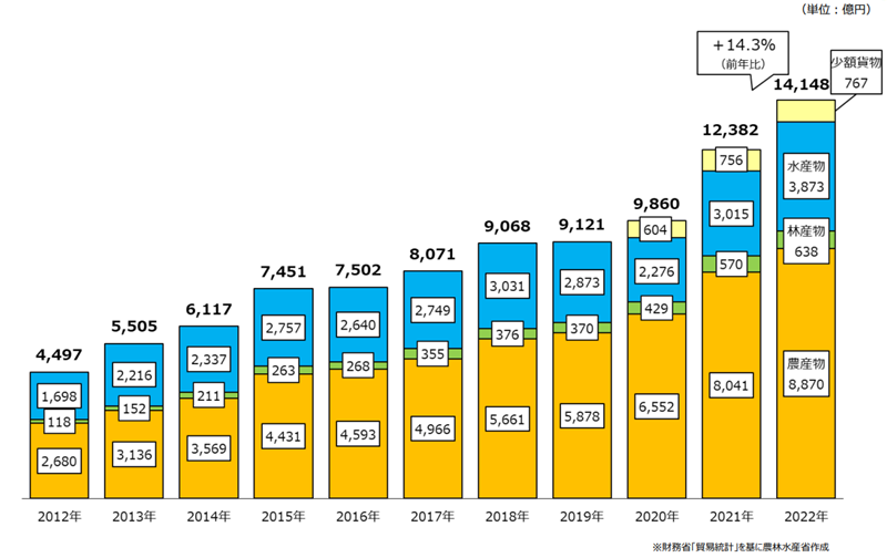 日本农林水产品和食品出口金额示意图。图片来源:日本农林水产省网站