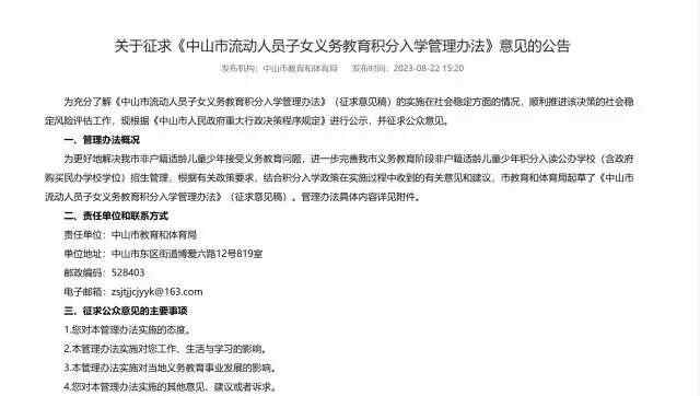 8月22日,中山市教育和体育局将《中山市流动人员子女义务教育积分入学管理办法》(征求意见稿)进行公示,并征求公众意见。