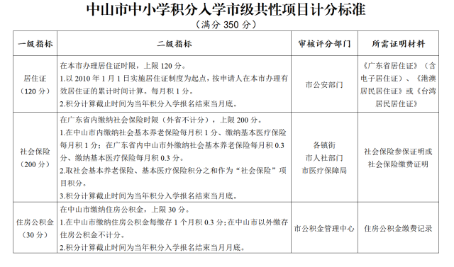 市级共性项目设“居住证”“社会保险”“住房公积金”等三项,侧重在中山市内的居住、参保和缴纳公积金要求,体现了申请积分入学基础积累和教育公平要求。居住证以2010年1月1日实施居住证制度为起点开始计算,其它项目以实际缴纳费用开始计算,各项目积分计算截止时间为统一为当年积分入学报名结束当月底。具体积分标准看下图。