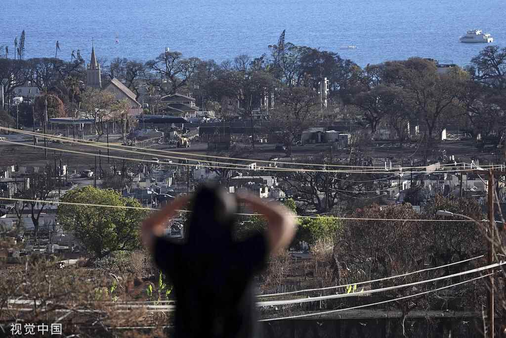 当地时间2023年8月20日,美国夏威夷,一名妇女看着被烧毁的拉海纳镇。因政府应对大火迟缓,当地社区已失去对政府的信任。(图源:视觉中国)