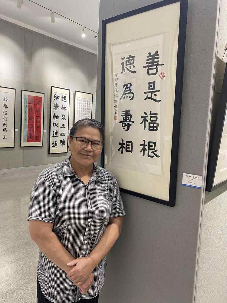 今年66岁的游群杰拄着拐杖来到了现场,她带来展览的是一幅书法作品《善是福根 德为寿相》。“我以前是握‘枪杆子’,退休后我终于拿起了心爱的‘笔杆子’,在水墨里享受快乐。”游群杰曾是一名女子射击运动员,从事残疾人体育运动多年。退休后,她在2013年参加了广州市残联举行的书法培训班,自此爱上了书法。