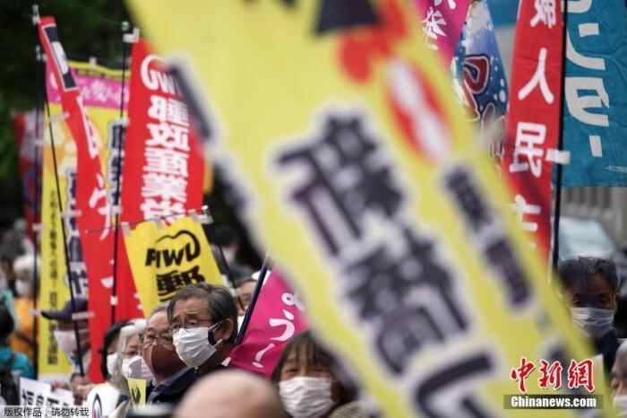 2021年4月13日,日本政府正式决定将福岛核污染水经过滤并稀释后排放入海。图为日本民众在日本首相办公室外举行抗议活动。