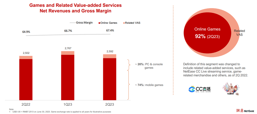 从两张表格数据中可以看到,游戏及相关增值服务是网易赚钱的主力,贡献接近9成。游戏及相关增值服务包含网易CC直播、游戏相关商品等,其中单纯在线游戏的收入占比始终保持在90%以上,在线游戏收入方面手游和端游的占比分别为74%和26%。