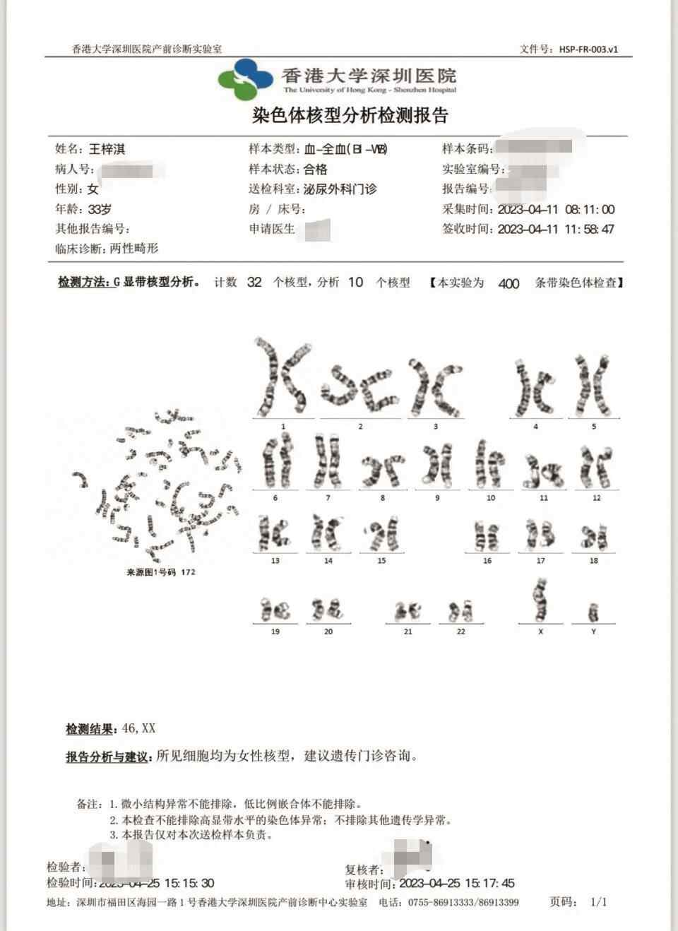 王梓淇是一名真两性畸形患者,她拥有双重性腺,体内既有卵巢又有睾丸,外生殖器与第二性征介于两性之间。从有性别意识起,王梓淇就觉得自己是个女生。她的染色体核型分析检测报告也显示“所见细胞核型均为女性”。