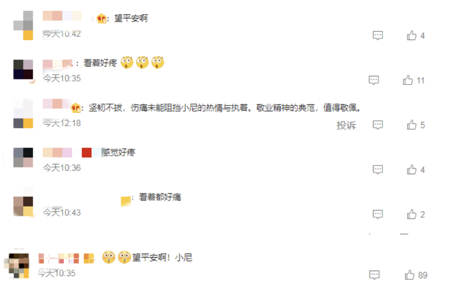 《你好生活第四季》节目官微@一个大宝同学 发文称:“开拍前,和小尼说:‘这一季,来什么,都受着,都是生活该面对的。包括意外与惊吓。’但小尼录节目受伤那一刻很想收回说过的话。摔成这样了,说继续录的是你,开着玩笑让所有人不用担心的是你。”
