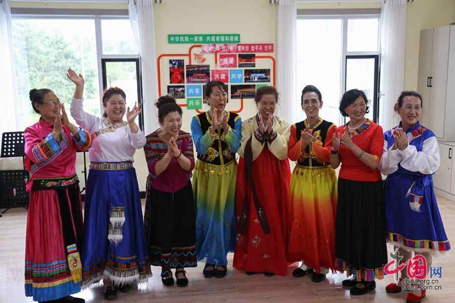 丹英社区各民族居民在参加文艺排练后合影。尽管文化不同、习俗不同,但各民族居民互帮互助,相亲相爱,共叙民族团结情谊。中国网记者 伦晓璇 摄