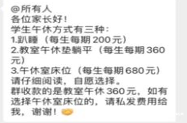 家长发出的截图显示,在某班级微信群内,一名ID为“某老师”的用户发文:“各位家长好,学生午休方式有三种:1.趴睡(每生每期200元)2.教室午休垫躺平(每生每期360元)3.午休室床位(每生每期680元) 请仔细阅读,自愿选择。”