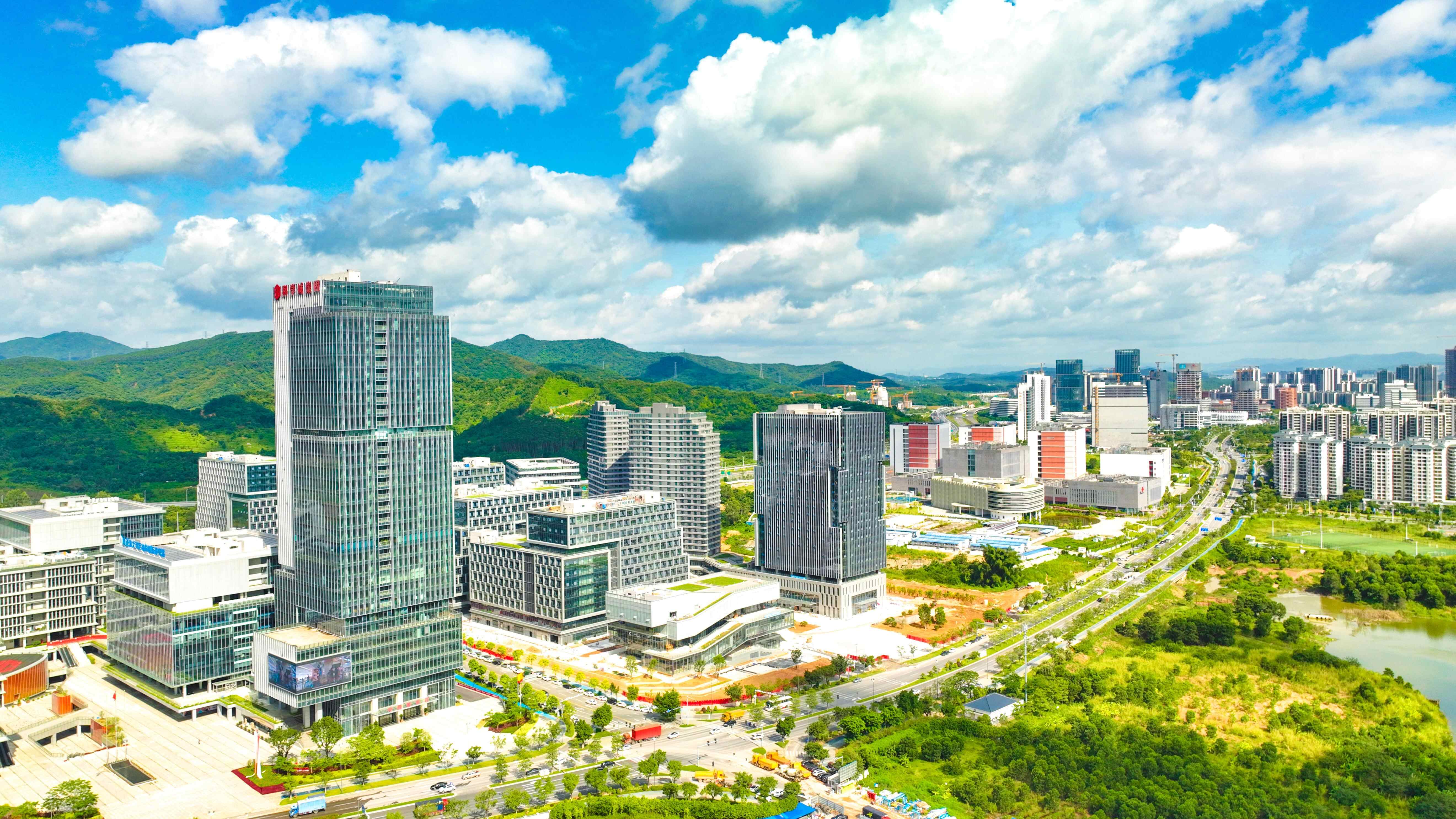 建设绿色低碳生态——知识城借鉴新加坡邻里中心体系建设经验构建公共服务体系,建设“三山相拥、城景交融”的公园城市,荣获了国家三星级绿色生态城区认证,城市生态禀赋优良,城市内随处见绿。