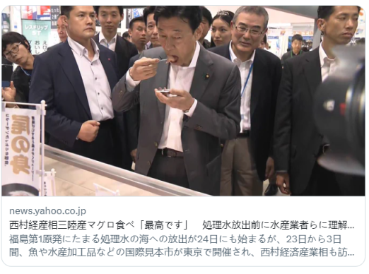 此前,也曾有日本官员为了给水产背书食用海鲜食品。8月23日,日本经产大臣西村康稔来到东京国际渔业水产展览会给商家打气,当场食用了金枪鱼等海鲜制成的食物,还不断称赞“棒极了,感觉午饭和晚饭都不用再吃了。”