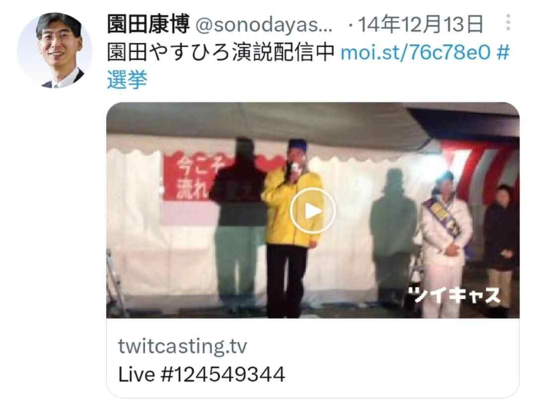 当时园田康博落选众议院议员总选举,回到家乡再次竞选依旧失败,后来他没有再出现在公众面前。他的社交媒体个人账号更新停留在2014年12月,最后一条发帖是竞选演讲视频。