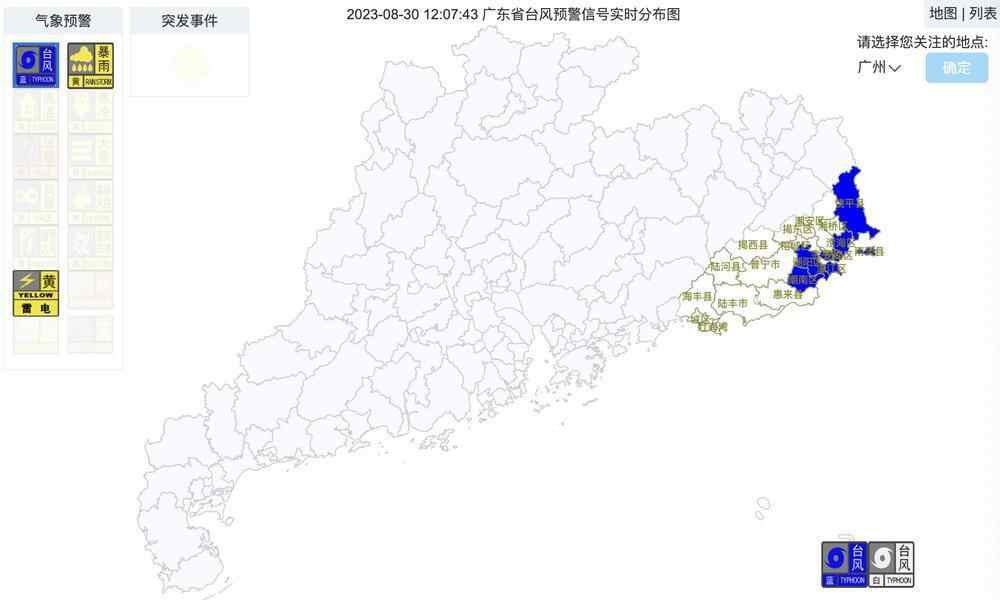 由于“苏拉”趋近,粤东沿海地区自8月29日下午起已陆续发布台风预警信号。截至8月30日11时06分,饶平、澄海、南澳、汕头、潮阳等地已升级台风预警信号至蓝色;潮州、揭阳、揭西、普宁、惠来、陆丰、海丰、陆河、汕尾等地台风白色预警信号生效中。随着“苏拉”进一步趋近,不排除广东各地继续发布或调整台风预警信号。