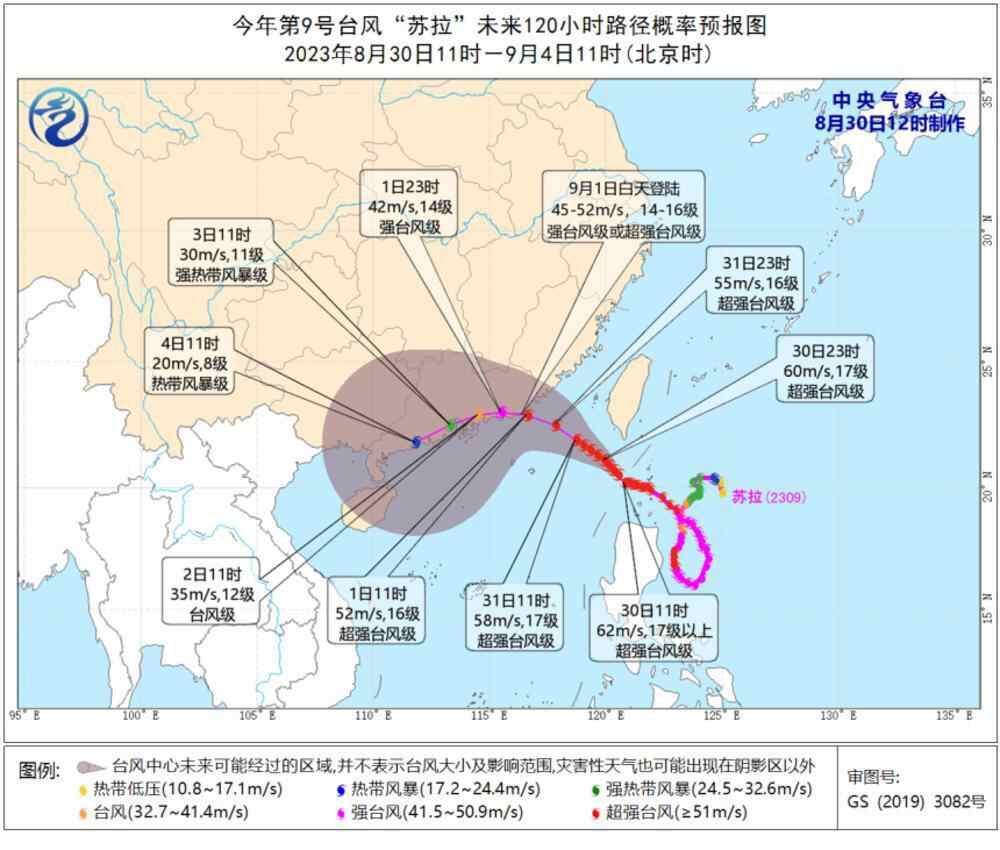 根据中央气象台观测,“苏拉”中心8月30日11时距离广东省惠来东偏南方向约560公里(北纬20.2度、东经120.8度),中心附近最大风力17级以上,达到超强台风级别。中央气象台预计,“苏拉”将以每小时10-15公里的速度向西北方向移动,于8月30日夜间或31日凌晨移入南海东北部海面,逐渐向广东东部到福建南部一带沿海靠近,有可能于9月1日白天在上述沿海地区登陆(强台风级或超强台风级,45-52米/秒,14-16级),也有可能在广东东部近岸海面向西偏南方向移动。