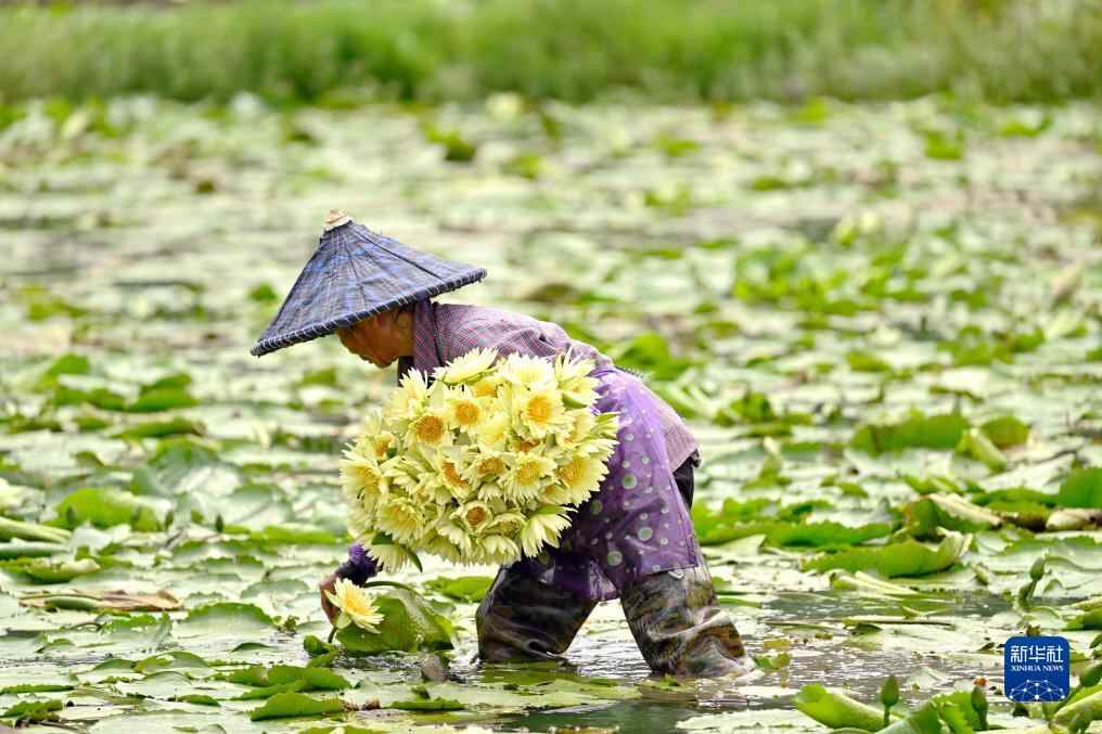 8月30日,在广西柳州市柳江区百朋镇怀洪村,农民在采收莲花。