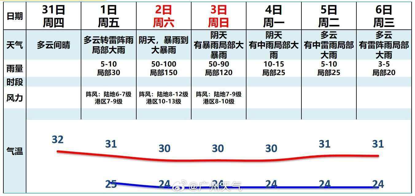 31日夜间至9月3日,粤东市县、梅州南部、河源南部和珠江三角洲中南部市县有暴雨到大暴雨局部特大暴雨,其余市县有雷阵雨局部暴雨。其中31日夜间至9月2日,东部沿海市县风力逐渐加大到8级~10级,阵风11级~12级,台风中心经过的附近市县旋转风13级~15级,阵风16级左右。