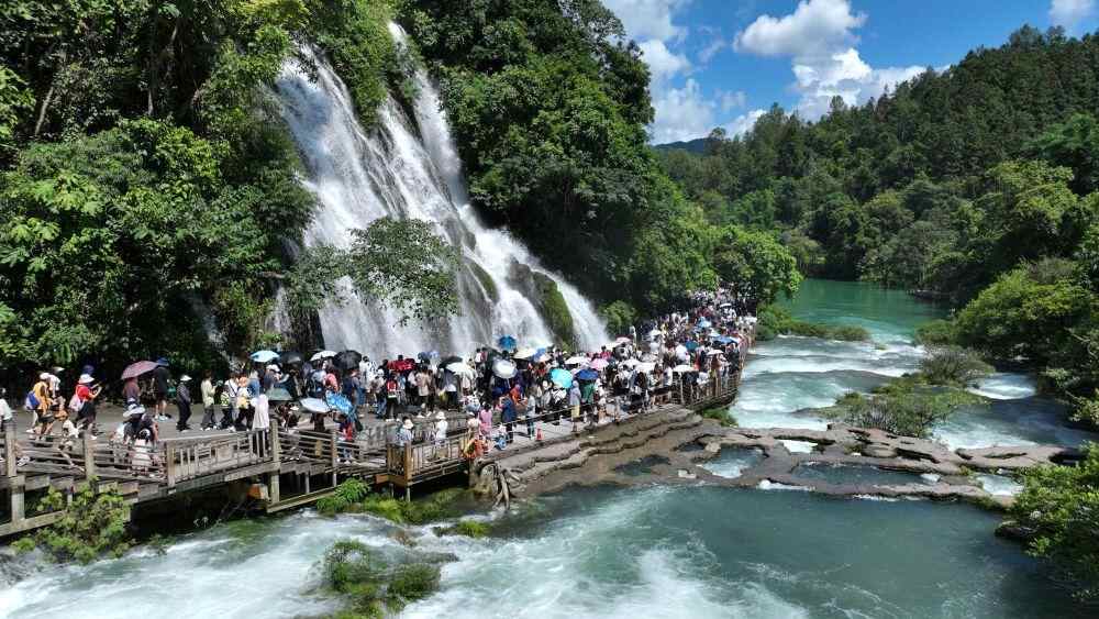 从“多彩贵州”到“壮美广西”,贵南高铁串起一条自然与人文景观密集的“黄金旅游线”。在荔波樟江风景名胜区,小七孔景点游人如织。