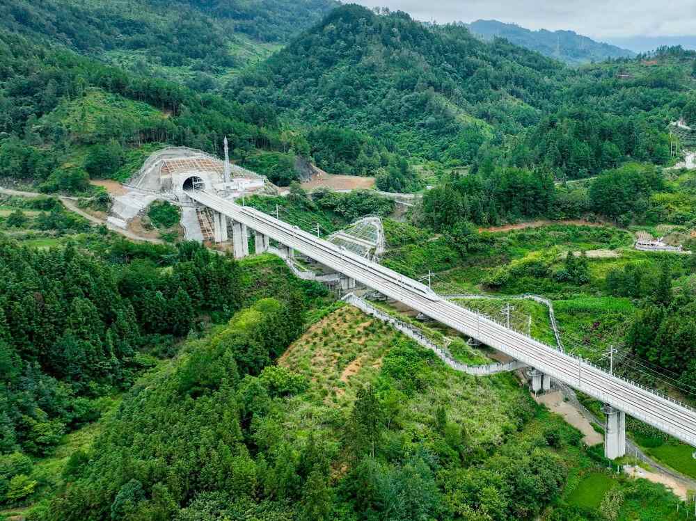 试验动车组穿过长达17公里的九万大山一号隧道(8月23日摄,无人机照片)。新华社记者 欧东衢 摄