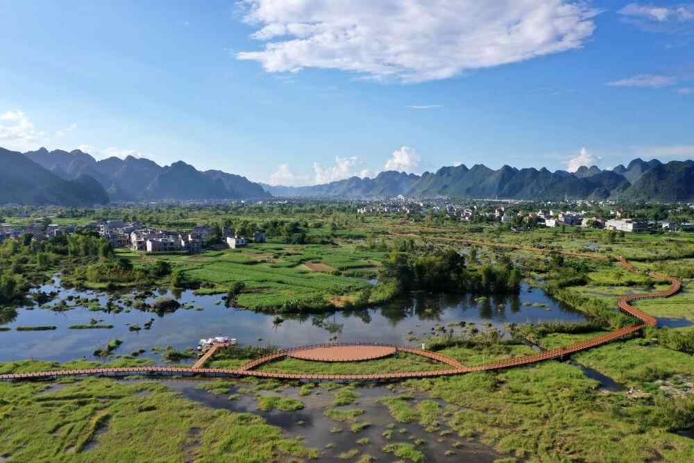 2021年8月31日拍摄的广西都安瑶族自治县澄江国家湿地公园景色(无人机照片)。新华社记者 陆波岸 摄