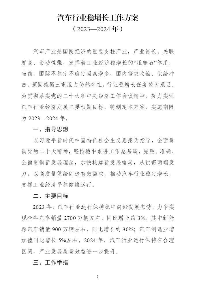 9月1日,工业和信息化部等七部门发布关于印发汽车行业稳增长工作方案(2023—2024年) 的通知,全文如下:
