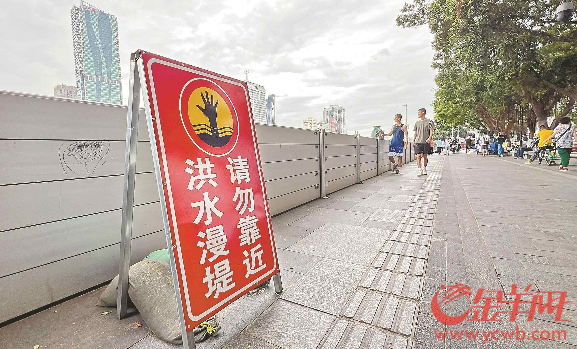 记者9月1日在天河区临江大道员村亲水平台看到,该处的亲水平台已加装防潮挡板,并在亲水平台最靠近江边的一层设置警戒线,提醒游玩戏水的市民留意涨水风险。在荔湾区沿江西路近南方大厦处的亲水平台,同样也设置了防潮挡板。在防潮挡板外围,还摆设了多个提醒水位可能漫堤的警示牌,提醒市民警惕涨水风险。在临近南方大厦亲水平台的沙面,记者看到临近珠江和沙基涌的岸边,均设有防潮挡板,挡板上张贴了告示提醒市民注意潮水影响。除了防潮挡板,记者在沙面部分出入口还看到有沙包放置,以便潮水上涨时可立即取用防御。