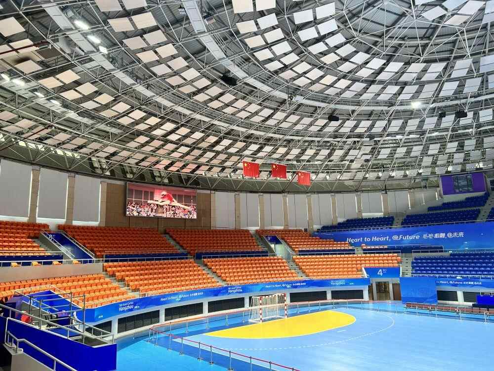 按照亚运会赛事要求,之前的地板回弹率不达标,因此场馆内需要新铺设更为专业的运动地板,铺有双层龙骨和弹性胶垫,具有良好的弹性减震作用和吸收冲击能力,在身体碰撞激烈的手球比赛里可以更好地保护球员安全。