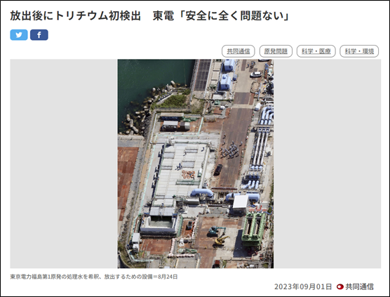 日本东京电力公司1日发布消息称,自福岛核污染水排海后,日本方面在8月31日于排放口附近取样的海水中首次检测出放射性物质氚。不过,东电在通报中声称,氚浓度“在安全上完全没有问题”。