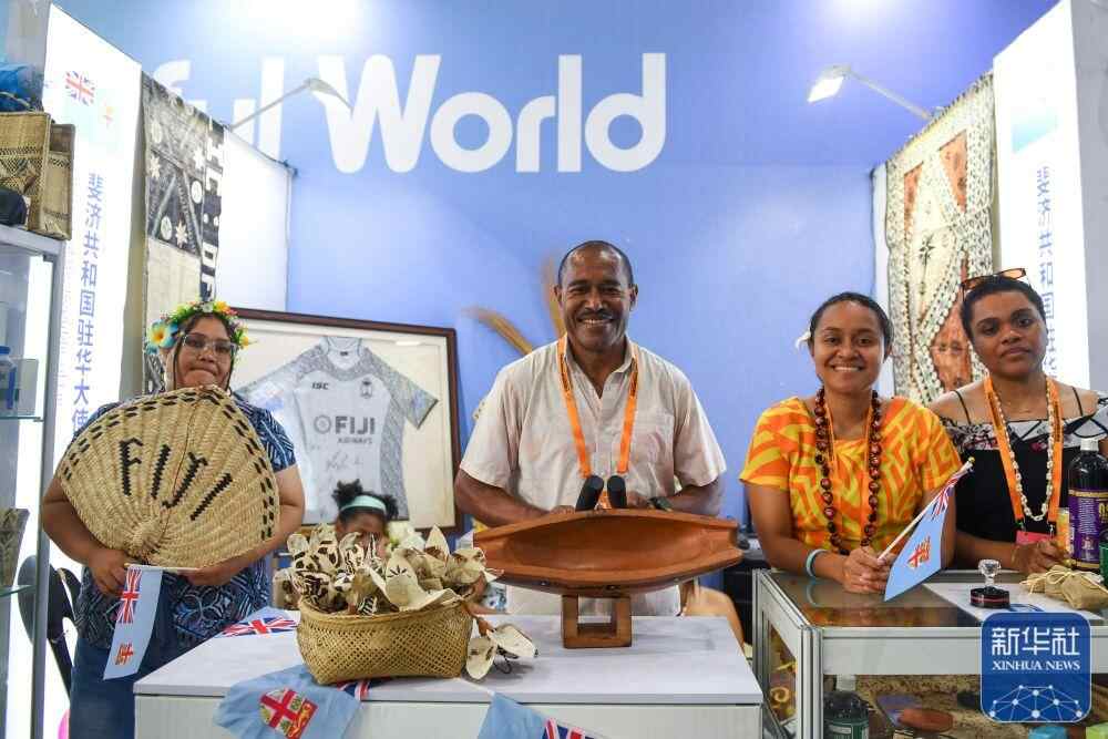 ↑9月2日,在“一带一路”沿线国家特色文化展示活动上,斐济共和国驻华大使馆展区的工作人员展示特色乐器。