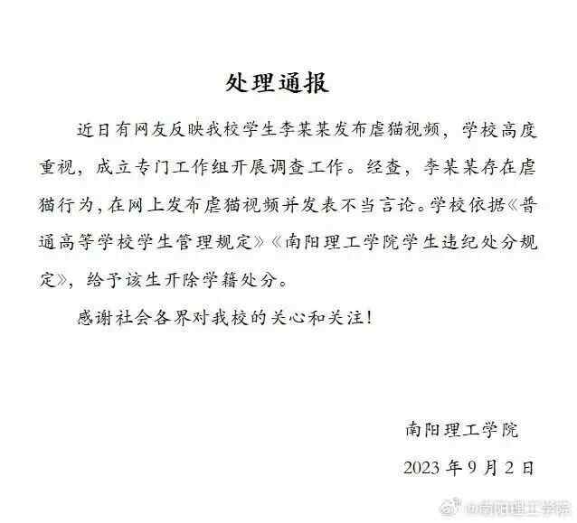 9月2日,河南南阳理工学院发布情况通报称,经查学生李某某存在虐猫行为,在网上发布虐猫视频并发表不当言论。学校依据《普通高等学校学生管理规定》《南阳理工学院学生违纪处分规定》,给予该生开除学籍处分。