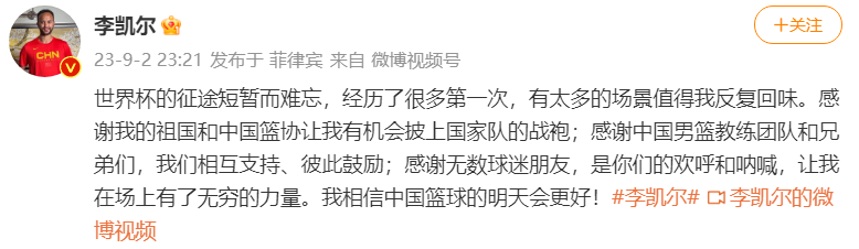 2日晚,中国男篮队员@李凯尔 发布微博:
