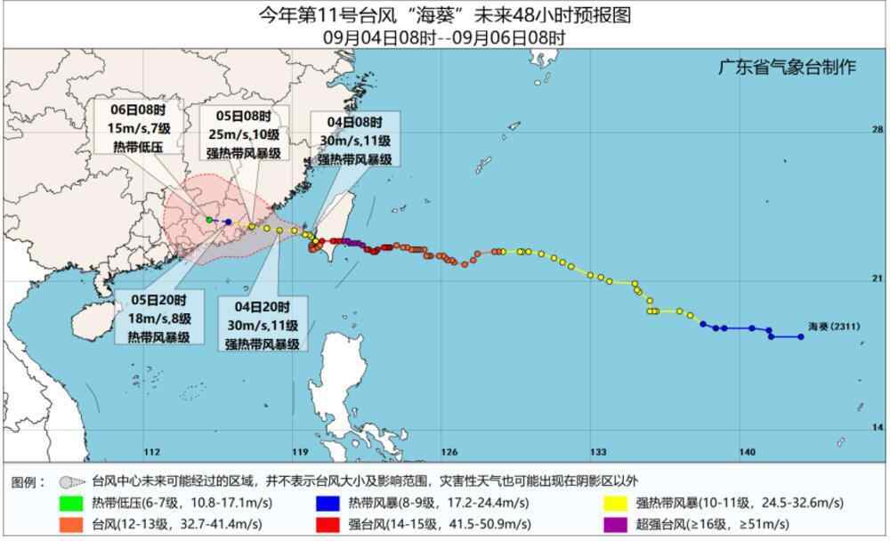 截至9月4日11时,今年第11号台风“海葵”已减弱至强热带风暴级,广东省气象部门预计,“海葵”将在9月5日早晨到中午在福建漳浦至广东惠来一带沿海登陆。