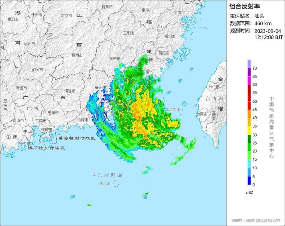 虽然“海葵”强度减弱,但广东依然维持对“海葵”的预警。截至9月4日12时,广东东部沿海及部分内陆市县最高预警信号维持台风黄色预警“停课信号”。观察9月4日12时12分的汕头气象雷达,可见“海葵”的降水云系已开始影响粤闽交界一带。