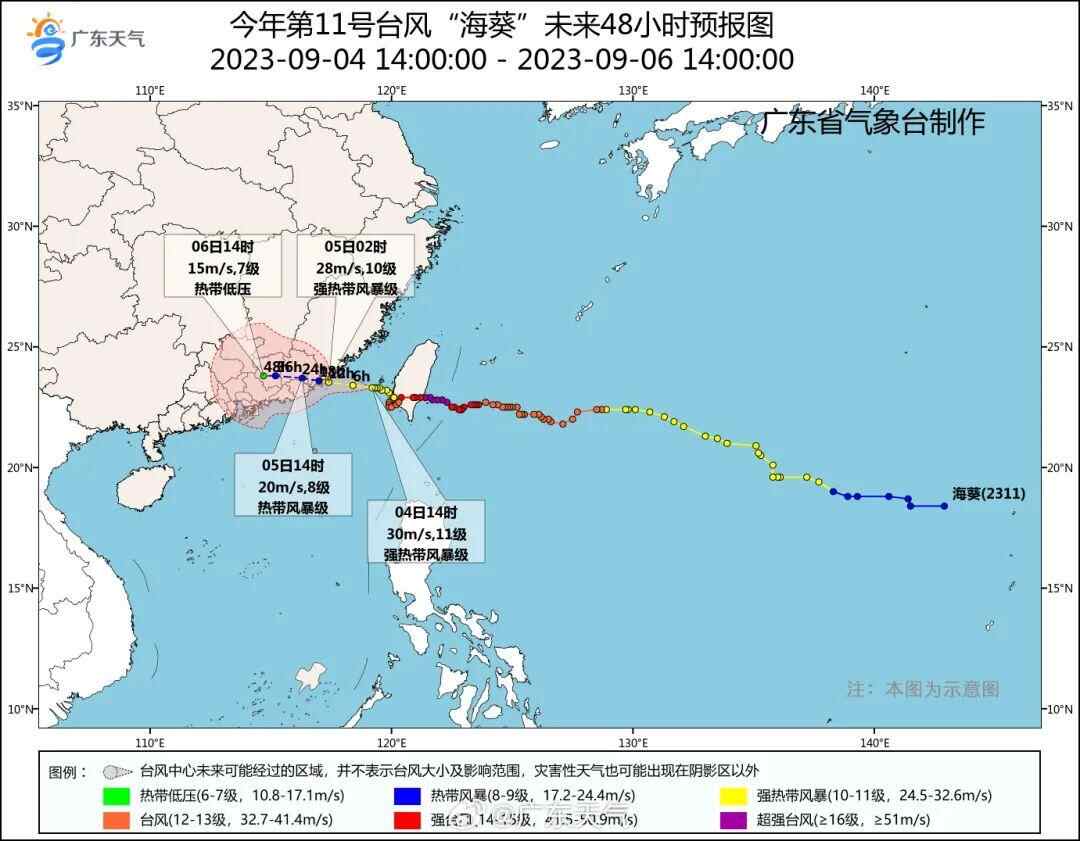 广东省气象台9月4日预计,9月4日余下时间广东东部市县多云转大雨到暴雨局部大暴雨,粤西市县有分散阵雨,广东其余市县多云。粤东沿海夜间风力加大到8级左右,粤东偏东海面、台湾海峡风力7~11级、阵风12~13级,巴士海峡和南海东北部偏东海面风力6~8级、阵风9~11级。