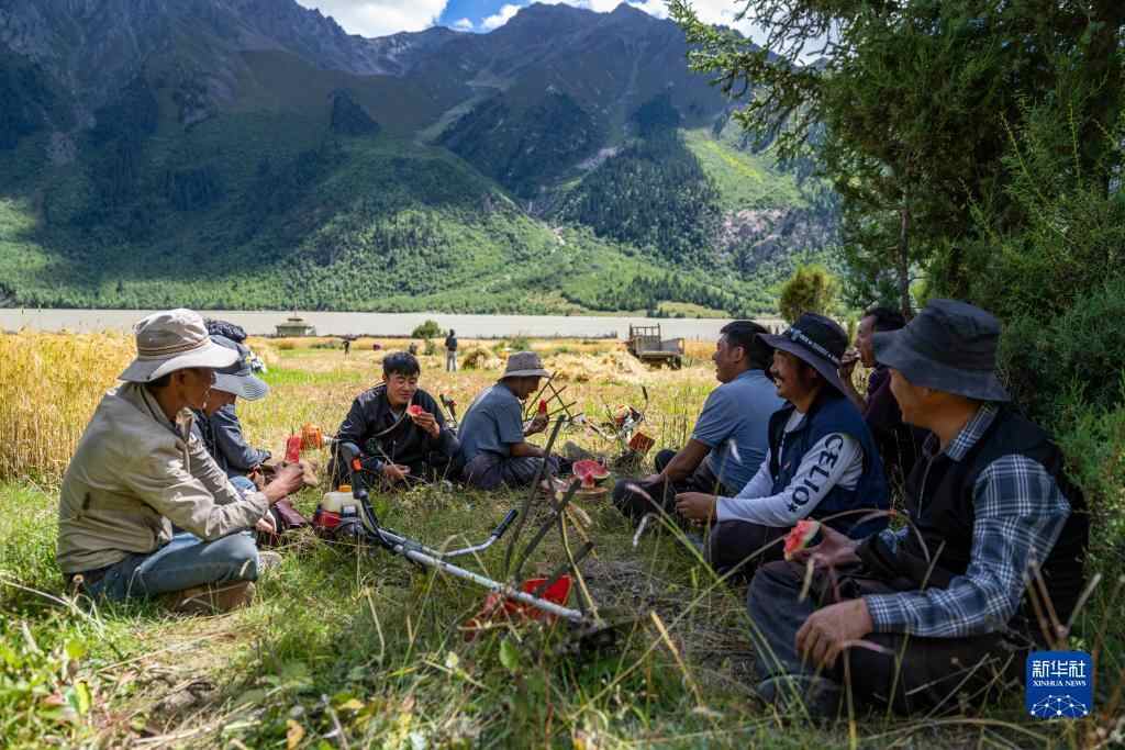 位于西藏昌都市八宿县境内的然乌湖是西藏东部最大的湖泊,八宿县然乌镇瓦巴村坐落在然乌湖畔。正值秋收农忙时节,大片金黄的青稞在风中摇曳,然乌湖景与秋收盛况交相辉映,勾勒出一幅优美的田园画卷。