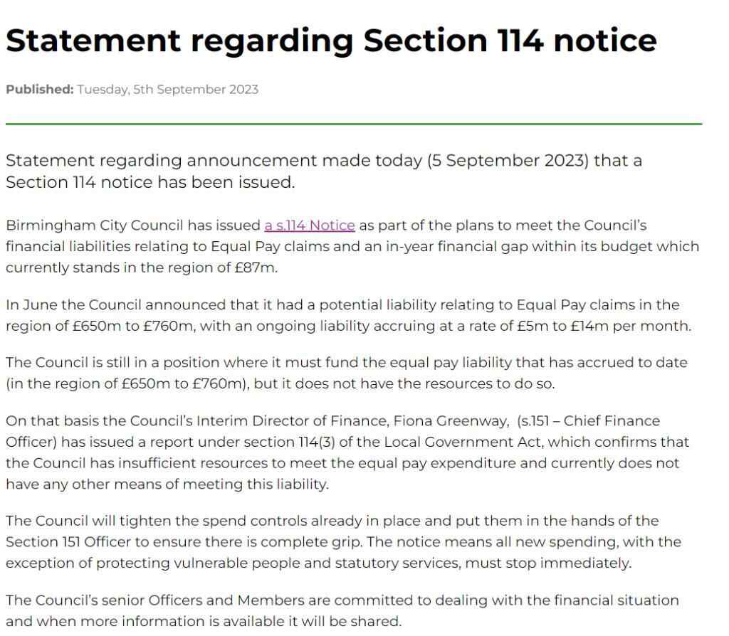 伯明翰市政委员会在5日的声明中亦提及,其与同工同酬赔偿有关的负债仍有6.5亿至7.6亿英镑,且负债以每月500万至1400万英镑的速度增加(笔者注:除了最初那174个人之外,不断有其他人借着这个判例向伯明翰政府申请赔偿),伯明翰市政委员并没有足够的资金或者其他手段来偿还这些债务。